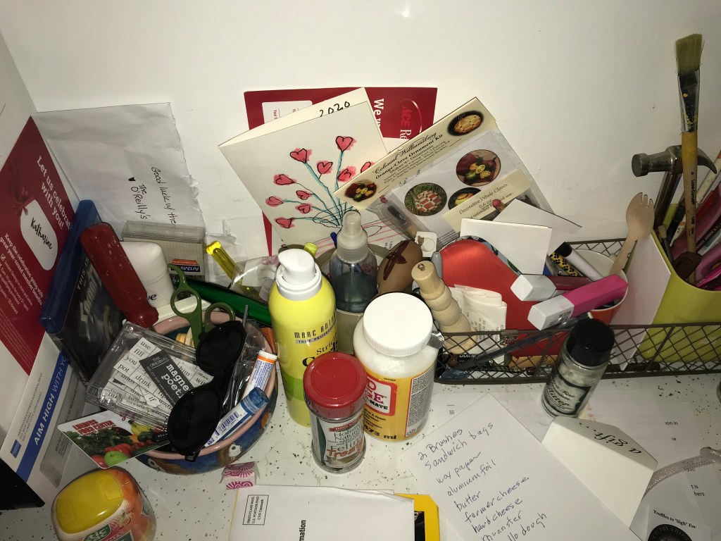 We don’t have a junk drawer, we kind of have a junk house. We have stuff all over. Antique reminders of life from the 50s are everywhere, you can find a lipstick or paper clip in every single room. Our kitchen counter is a catch all… I guess that is the closest we come to a junk drawer. I imagine a little kid would find this pile of randomness just as magical. Stuff just sitting around waiting for someone to need it.