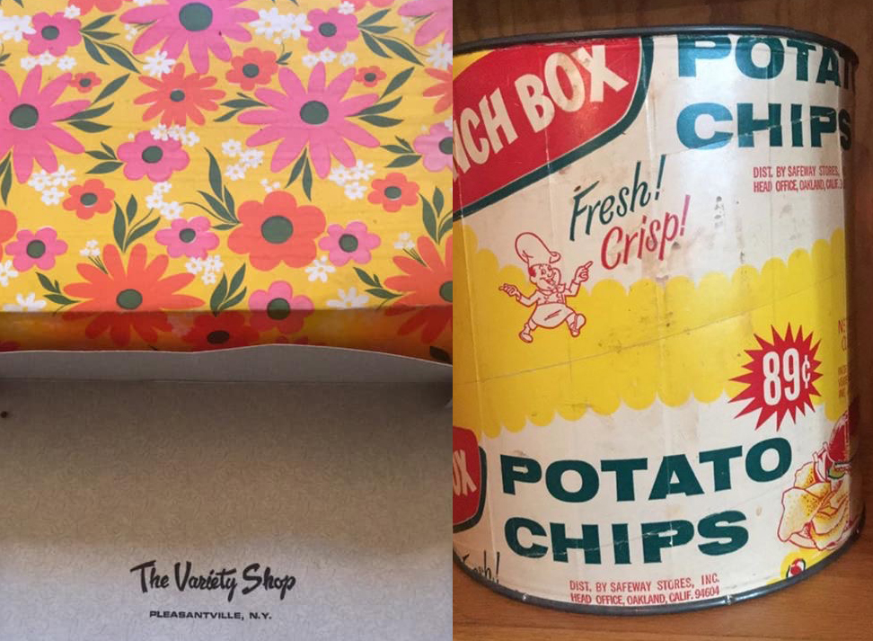 As I walked my guy to school recently I noted a bright and groovy shirt box from the 70s… out for bulk pick up. I was so disciplined and walked right past it. It was misty rain. It was a box. I need no more old stuff. On the way home, I thought of Evie. I thought of my potato chip packaging… and I removed that 70s box from the trash…saving it from a wet and ugly death. It dried out and I am thrilled to pieces with my save. It currently sits on a shelf in my studio next to a Coca-Cola crate from when coke was sold in bottles.