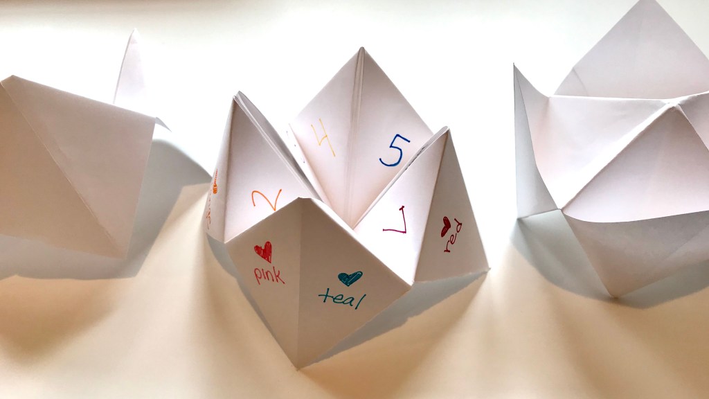 Do you remember Cootie Catchers, those little folded fortune tellers…pick a color or animal, then a number and poof…your future would be blurted out for all to hear. Who are you going to marry…a short rich man or a handsome cowboy, or Tommy (standing right next to you turning more purple by the moment)? They might predict what horrific thing would happen to you (you will eat 9 spiders today), or just something cruel (you are as ugly as a frog). So random but somehow it all meant so much.