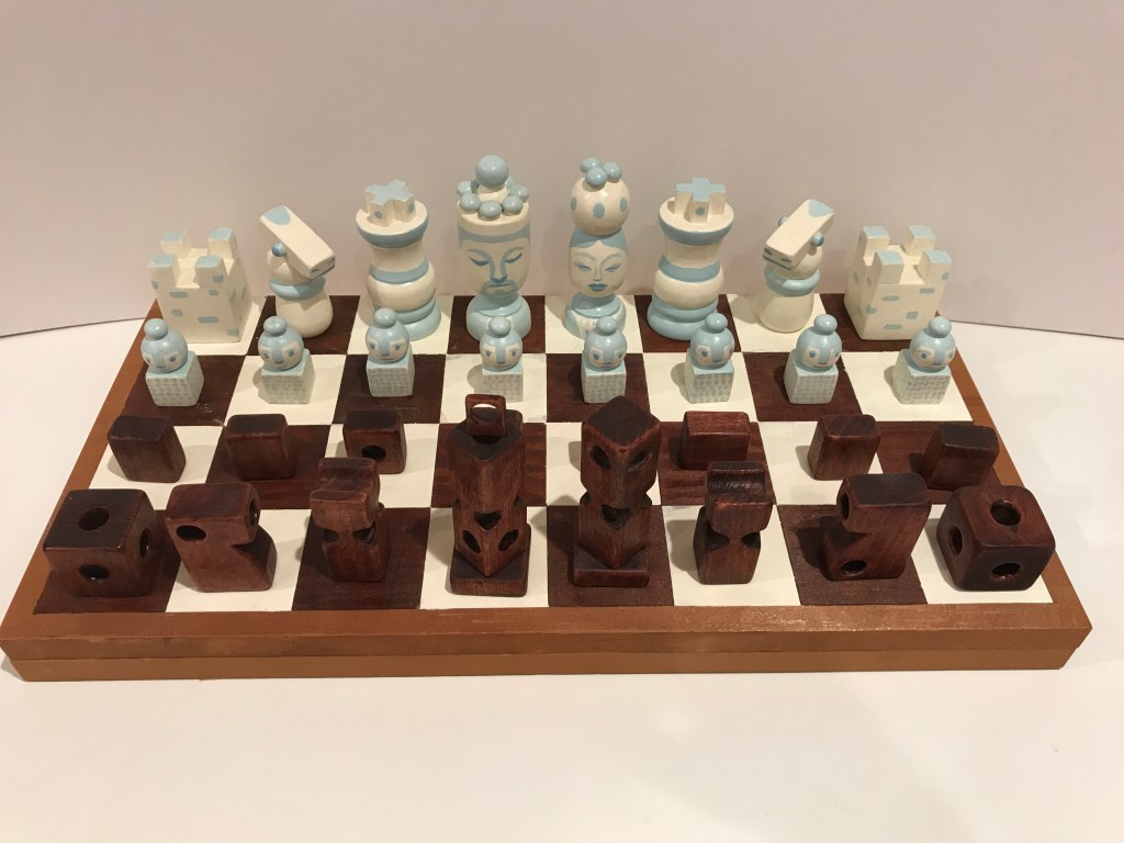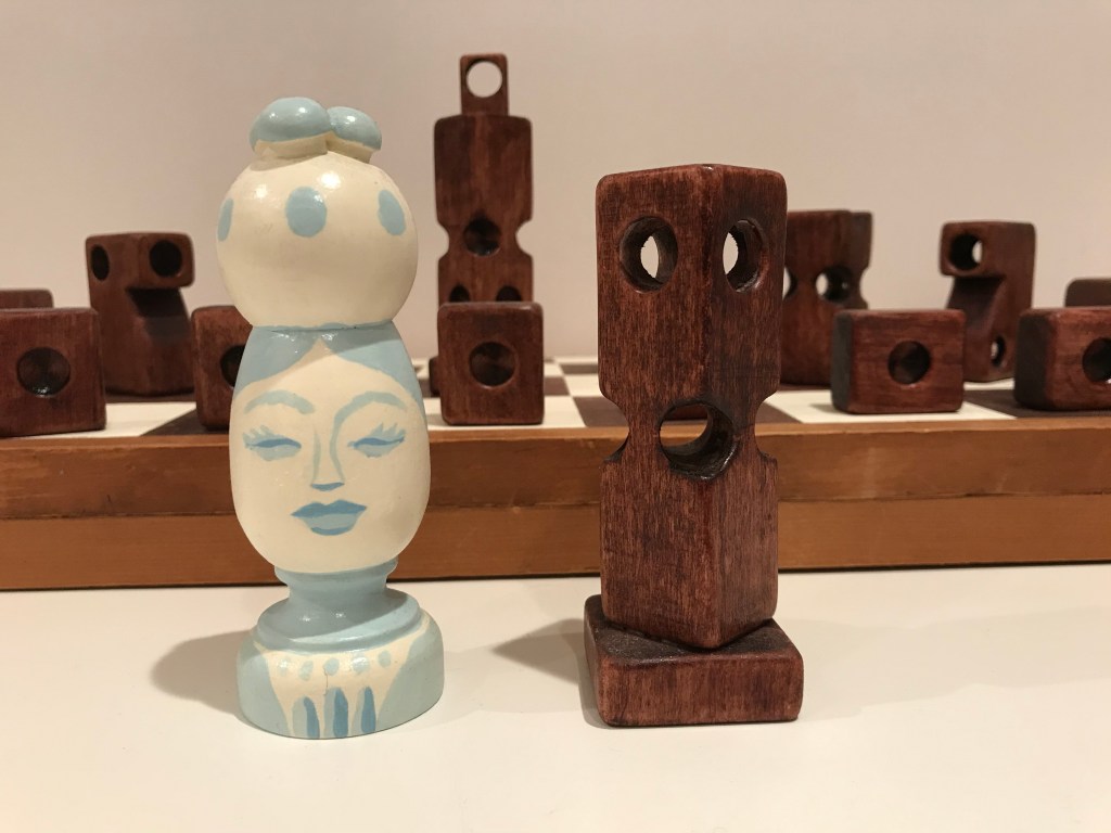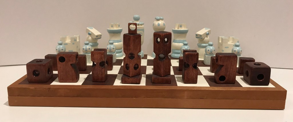 As they opened each chess piece they examined the other, two completely different solutions. One, wood carved into beautiful semi-realistic forms, painted in a representational manner, two toned, deliberate and detailed. The other, also carved wood, but from the mind of a gamesman with mid-century modern taste. Each streamlined piece had holes in it, representing the pieces’ movements…some holes went all the way through, that piece could move as many spaces as it wanted…some holes were just indents, that piece moved only one space. Two different solutions to exactly the same problem. Two minds. Two bits of spectacular. Listening to them talk, watching them appreciate the other…it was pure swoon.