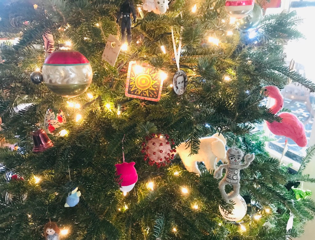 We have taken the idea of a mishmosh tree a bit further in our love of quirky…as represented in this cluster of goodness…a COVID-19 (virus? cell? what are they called?), a pussy hat egg, hand-painted fun done with Girl Scouts, a felted robot (purchased), a felted flamingo (made), an action figure with a missing head turned into a gift to dad (perfection), a duck missing one flipper from Grandma and Grandpa, a wooden Dorothy purchased at a sample sale in the toy district for my first tree, and a favorite from my sister-in-law many moons ago…Judy Garland, get it, garland on the tree. Immediately memories of 15 girls giggling doing crafts on my porch, tree-trimming parties, relatives, and neighbors with more creativity than should be allowed in one body come to mind. My brain explodes with joy and longing…the switch is flipped.
