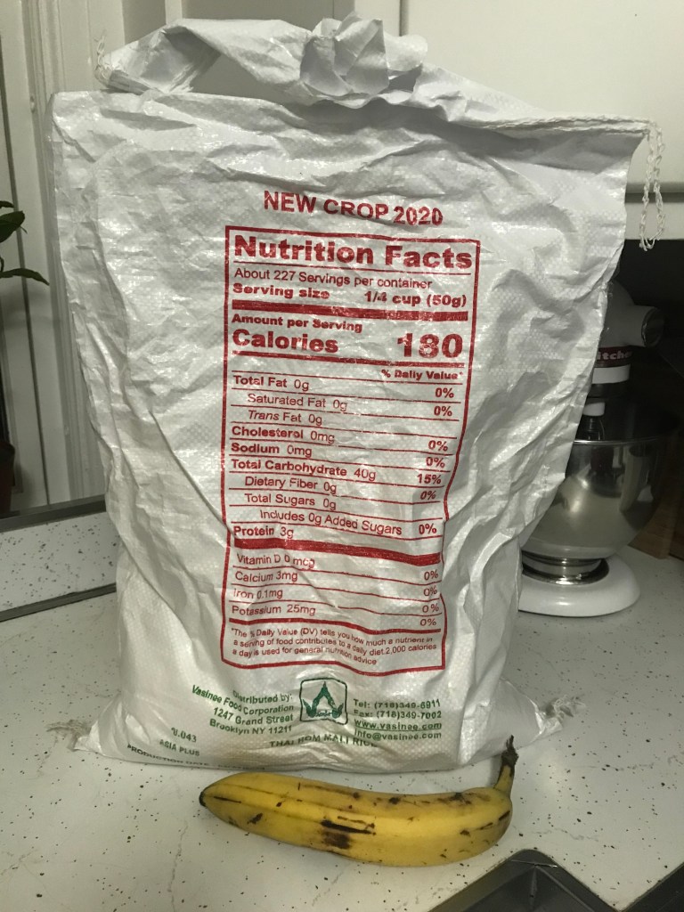 As I unbungeed it…yes, we close it with a bungee…to refill the container that lives in the cabinet, I realized this bag represents many phases of my life. As a mom of a little peanut of a child, I would have looked at this bag and thought, man, I could make the cutest a-line dress for Olivia with this. I had already made a dress out of a vintage pillow case for her…a rice bag dress…adorable. Next phase, I see a prop for Olivia’s grade school teeny tiny birthday party. We made oversized playing cards, candy bars, and other bits of hugeness for the kids to hold in their teeny tiny photoshoot. Fill this baby with cotton and bam, they would have looked amazing lifting this over their heads. Phase of the moment, a pat on the back for scoring this and other restaurant supply sized food items during the pandemic. Keeping my family fed was my main job, it all worked out.